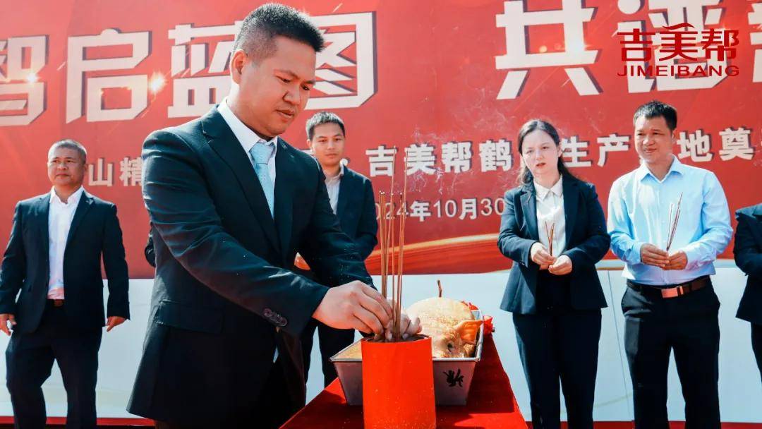 奠基仪式现场,来自广东吉美帮新材料有限公司的陈潮汉、刘薇薇女士、黄俊、梁启冠、刘智远、陈巧毅女士、陈潮佐等领导共同上台主持上香祈福仪式。焚香祈愿,一切顺心,平安喜乐,岁岁年年。